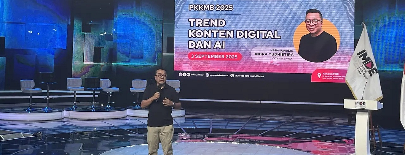 Kuliah perdana tahun ini, IMDE menghadirkan CEO Visual Indomedia Produksi (VIP) EMTEK Group Indra Yudhistira yang berbicara soal Trend Konten Digital dan Artificial Intelligence (AI). Sebagai seorang profesional dan experties di bidang film making, Indra menyampaikan perkembangan AI saling bersinergi, bahkan lebih cepat dari prediksi sebelumnya.